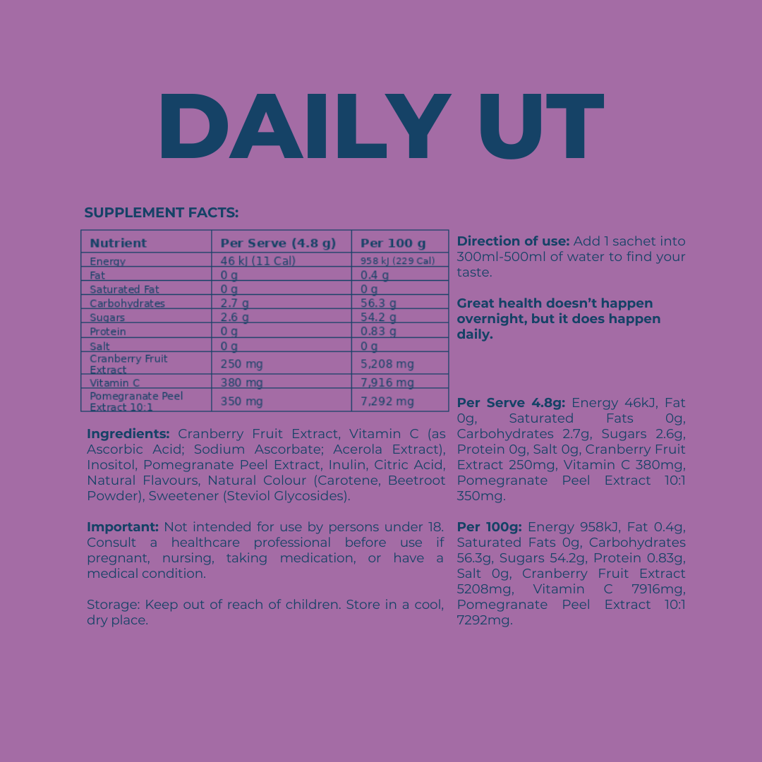 Daily UT is a refreshing cranberry-flavoured daily supplement designed to support urinary tract wellbeing and immune health as part of your everyday routine. With a crisp Cranberry flavour, it is easy to enjoy daily, whether you are travelling, busy, or simply looking to stay consistent with daily wellness support.